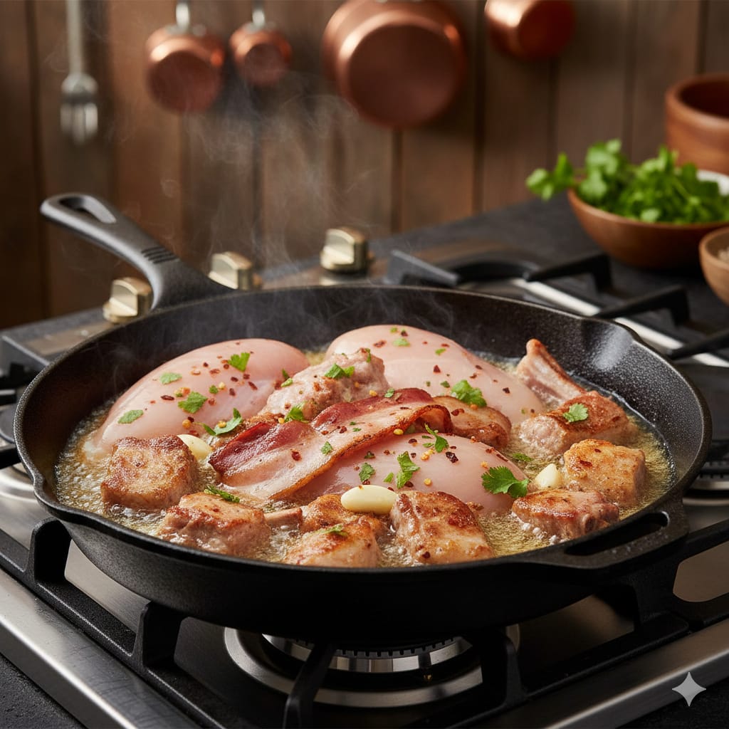 1. Ponga a dorar el pollo, el chicharrón y las costillas en una olla grande hasta que tomen color y suelten sabor.